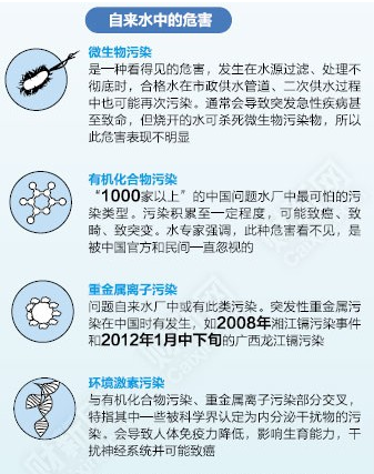 對(duì)日益惡化的水源污染問(wèn)題,自來(lái)水廠所采取的方式便是加入大量超過(guò)標(biāo)準(zhǔn)的氯(漂白粉)來(lái)消毒殺菌。專家指出,隨著經(jīng)濟(jì)的發(fā)展,人口的增加,不少地區(qū)水源短缺,有的城市飲用水水源污染嚴(yán)重,居民生活飲用水安全受到威脅。