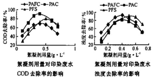 從上圖可以看出三種絮凝劑對(duì)印染廢水的濁度去除率都在81%以上,其中PAFC達(dá)到92.20%,PFS達(dá)到90.45%;在COD的去除率方面,PAFC達(dá)到90.58%,明顯高于PAC(69.58)和PFS(78.85%)。