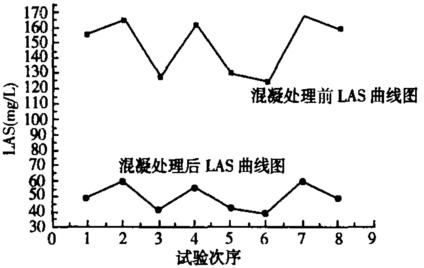 絮凝處理后,LAS的濃度得到有效的降低,降低了后續(xù)工藝的處理負荷,解決了高濃度LAS阻礙生物降解的問題。