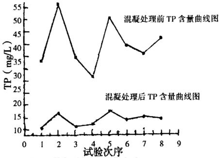 PAC 絮凝反應器的進水TP的含量在2614~5611mg/L之間,經過絮凝反應處理后,TP的含量降低到513~1211mg/L之間,去除率達到73.5%~84%。這說明絮凝處理對TP的處理效果較好。