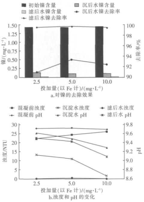 圖1聚合硫酸鐵投加量對(duì)鎳及濁度去除效果的影響