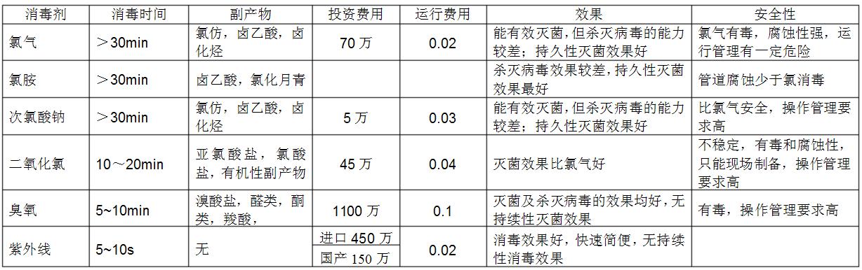 注:以10萬噸污水處理廠為例。氯氣設(shè)備為進(jìn)口加氯機(jī)配置國產(chǎn)氯氣中和裝置;二氧化氯為國產(chǎn)設(shè)備;臭氧為進(jìn)口設(shè)備。次氯酸鈉是按照投 加商品溶液計(jì)算。