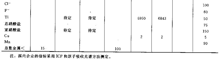 目前,雖然我國沒有對工業(yè)用水和廢水用混凝劑中重金屬的要求,但是國外多數(shù)廢水處理廠對重金屬有一定的限制,表3-15是某大型污水處理廠在國際招標(biāo)中對氯化鐵的要求。