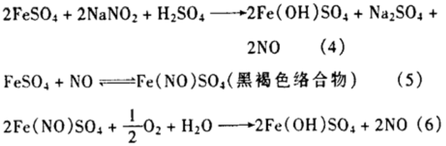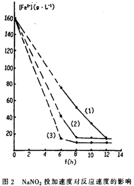 從圖2可見,反應至6小時,曲線(1)中亞鐵離子的濃度[Fe2+]為75.5g·L-1,而曲線(3)中[Fe2+]已下降到14·6g·L-1,反應速度提高了89.9%。表明反應速度隨著聚合硫酸鐵催化劑NaNO2投加速度的增加而增加。到反應后期,由于NOx轉化為NO-3而使Fe2幾乎不能轉化為Fe3+,但曲線(3)的結果仍比曲線(1)和曲線(2)的結果好。這主要是由于NaNO2具有如下的催化作用: