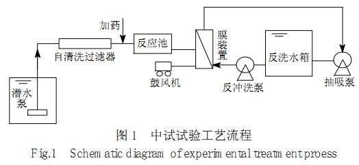 混凝小試主要采用燒杯和六聯(lián)攪拌器,六聯(lián)攪拌器設(shè)置參數(shù)為:快速120r/min,轉(zhuǎn)動(dòng)2min;慢速80r/min,轉(zhuǎn)動(dòng)8min,靜沉10min。中試試驗(yàn)裝置如圖1所示。
