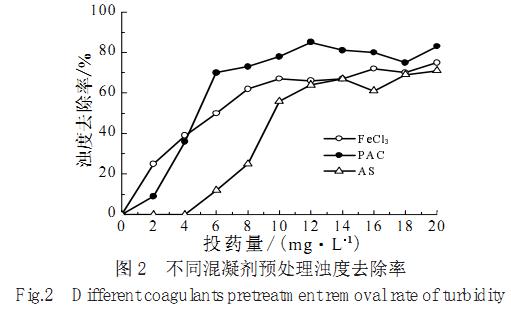 小試試驗(yàn) 由圖2可知,隨著混凝劑投加量的增加,濁度去除率在逐漸升高,當(dāng)斜率達(dá)到最大值時(shí),繼續(xù)增加投藥量,濁度去除率緩慢增高并逐漸趨于平緩。由此可知,混凝劑最佳投藥量:FeCl3為8mg/L,濁度由原來的2.35NTU降為0.9NTU,去除率為62%;PAC為6mg/L,濁度由原來的2.72NTU降為0.82NTU,去除率為70%;AS為12mg/L,濁度由原來的2.52NTU降為0.89NTU,去除率為64%。3種混凝劑均達(dá)到最佳投藥量時(shí),PAC對濁度的去除率稍高,FeCl3和AS去除效果相當(dāng)。