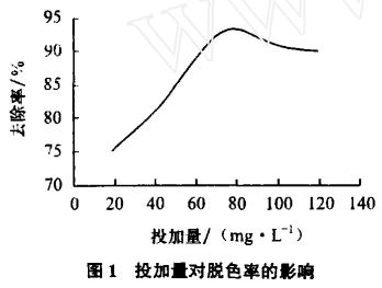 由圖3可看出,在60 - 80 r/min時攪拌速度對絮凝結(jié)果影響不大,小于這個范圍則由于水樣和絮凝劑混和不夠充分,反應(yīng)不完全;大于這個范圍,尤其是超過100 r/min之后,脫色率急劇下降,這是由于攪拌速度過快,使形成的絮團(tuán)又被打碎,因而絮團(tuán)非常小,沉降效果很差,絮凝后幾乎不分層,且沉淀時間很長,都會使得絮凝結(jié)果不理想。
